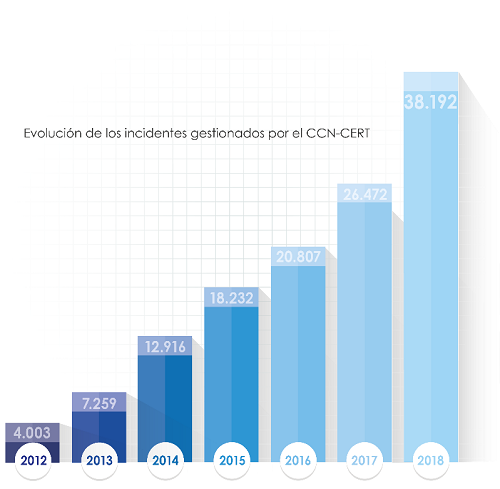 En relación con este último punto, durante los dos últimos años, el CCN-CERT gestionó un total de 64.664 incidentes en organizaciones del sector público y de empresas de interés estratégico; es decir, casi 89 incidentes diario, de los cuales, 2.219 fueron catalogados con un índice de peligrosidad “crítico” o “muy alto”.