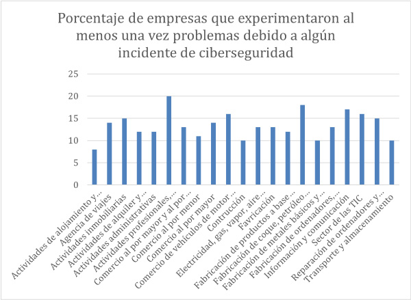 Los ciberdelincuentes atacan a todos los sectores empresariales sin importar el tamaño, pero algunos de ellos muestran una mayor incidencia. En el siguiente gráfico elaborado a partir del Dossier de Indicadores sobre Ciberseguridad y Confianza Digital en España y Europa del ONTSI de mayo de 2020 se obtiene la siguiente gráfica.