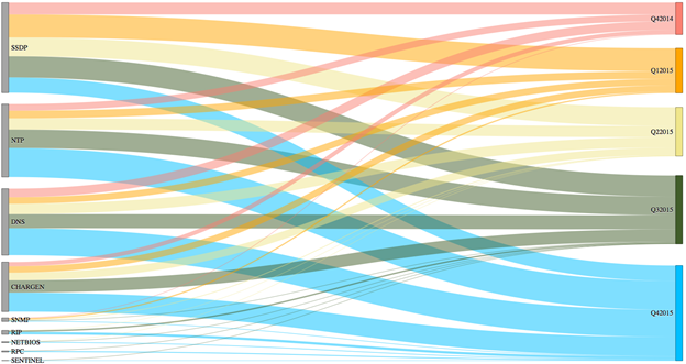 Ataques DDoS de reflexión entre el cuatro trimestre de 2014 y el cuatro trimestre de 2015