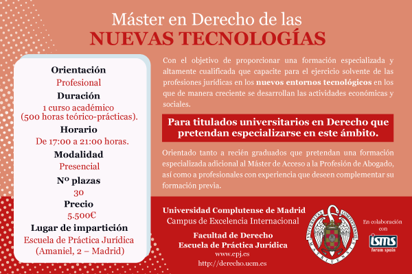 El nuevo Máster en Derecho de las Nuevas Tecnologías es un Título Propio de la Universidad Complutense de Madrid en el que ISMS Forum colabora. Su objetivo es proporcionar una formación especializada y altamente cualificada, que capacite para el ejercicio solvente de las profesiones jurídicas en los nuevos entornos tecnológicos en los que de manera creciente se desarrollan las actividades económicas y sociales.