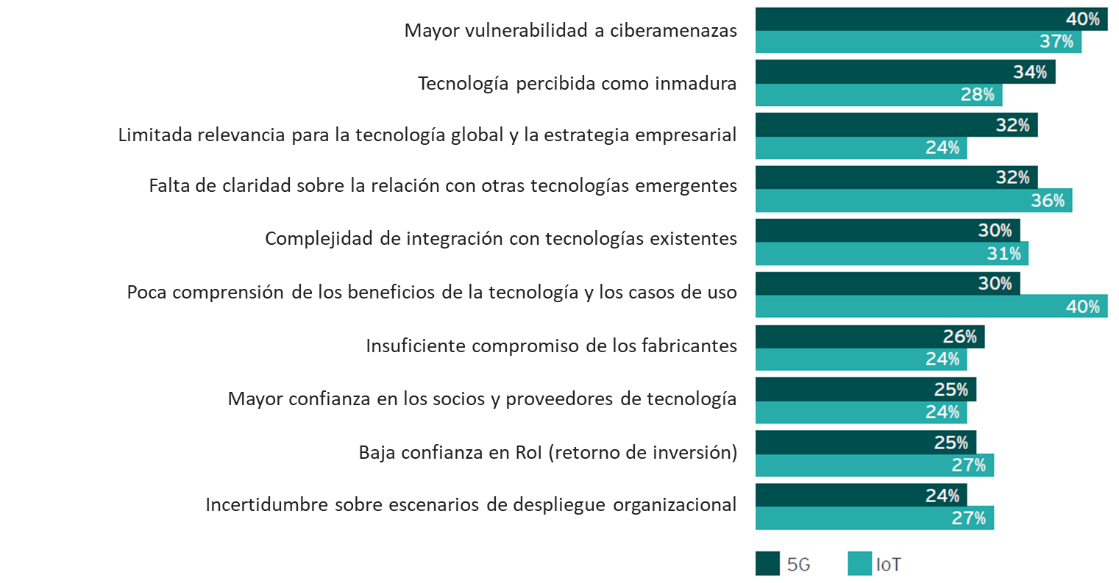 A continuación, se muestra un gráfico sobre una encuesta realiza a CIOs/CISOs de grandes empresas sobre las principales preocupaciones de adopción de iniciativas 5G e IoT: