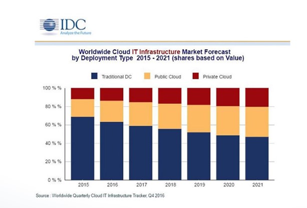 Según la International Data Corporation (IDC) en el 2021 solo quedarán un 50% de las infraestructuras físicas actuales mientras que el otro 50% se dividirá a partes iguales entre la Nube privada y la Nube pública.